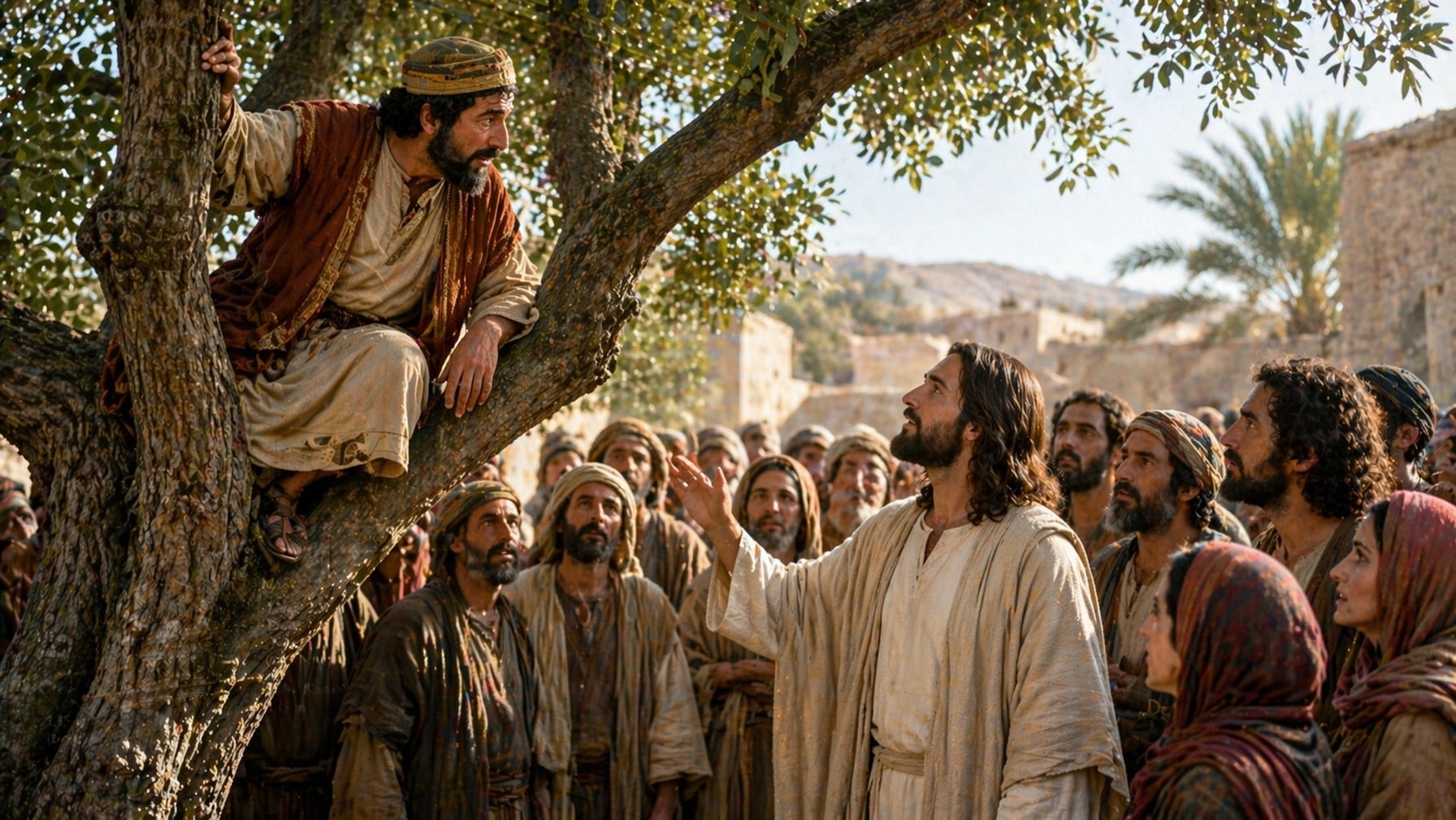 Cuando Jesucristo pasa por Jericó, Zaqueo quiere verlo a toda costa. Como es pequeño, se sube a un árbol.