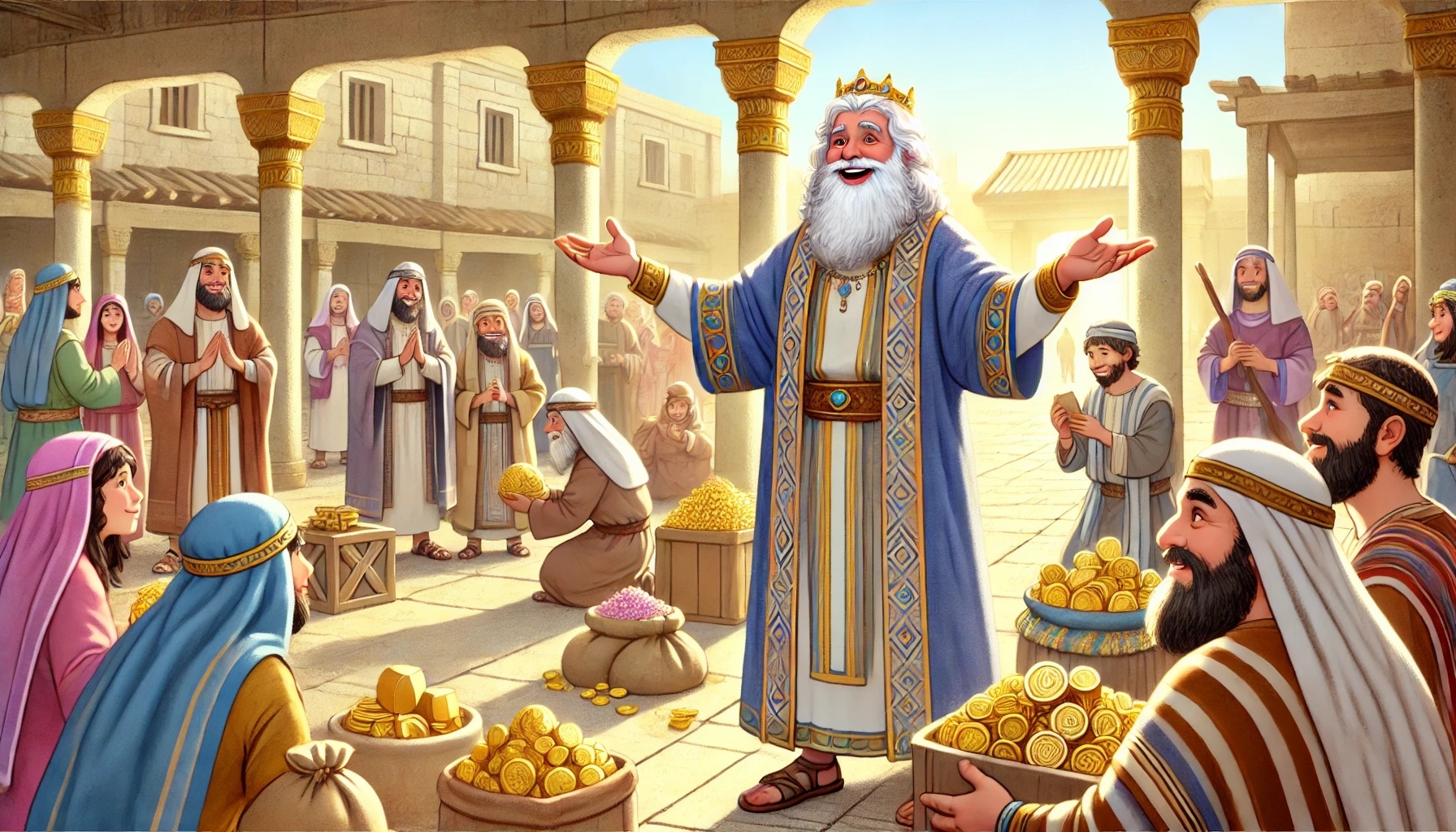 David da generosamente para el templo y da el ejemplo. El pueblo lo sigue voluntariamente y con alegría. Juntos viven un momento especial lleno de gratitud. Salomón es hecho rey, y la vida de David termina en paz.